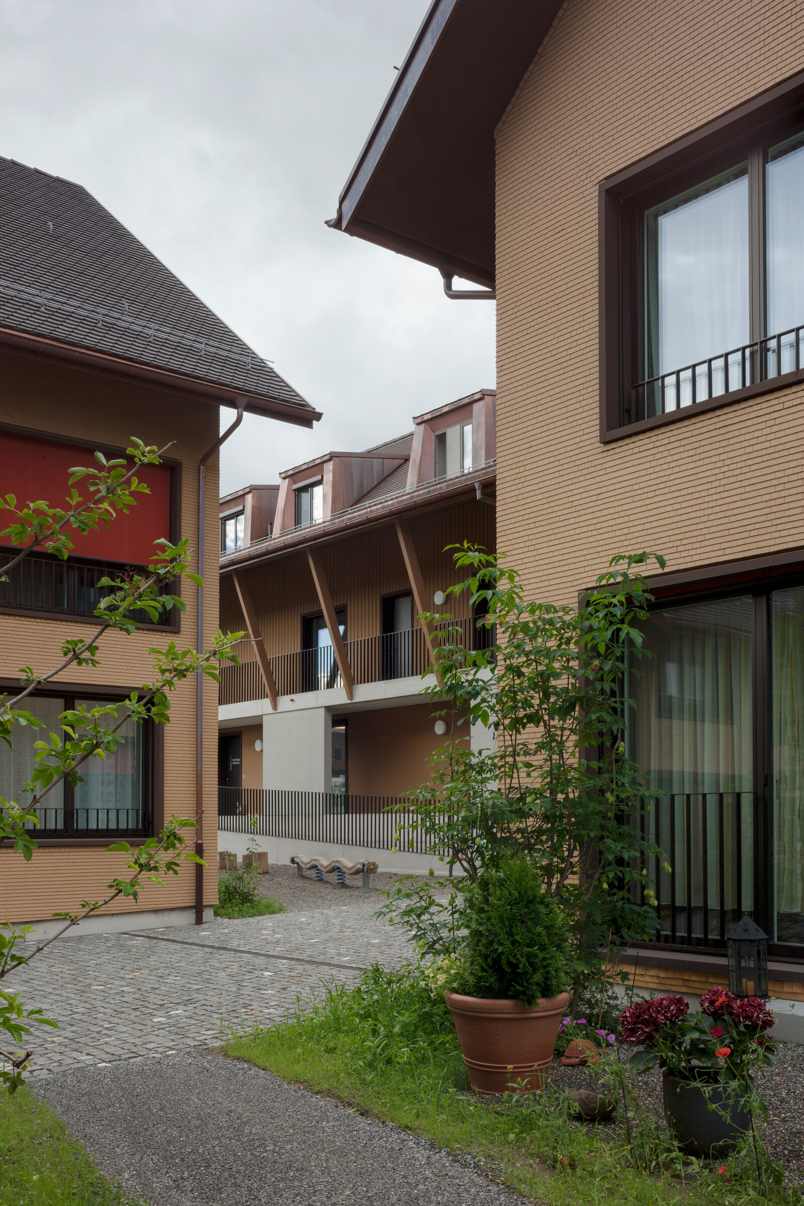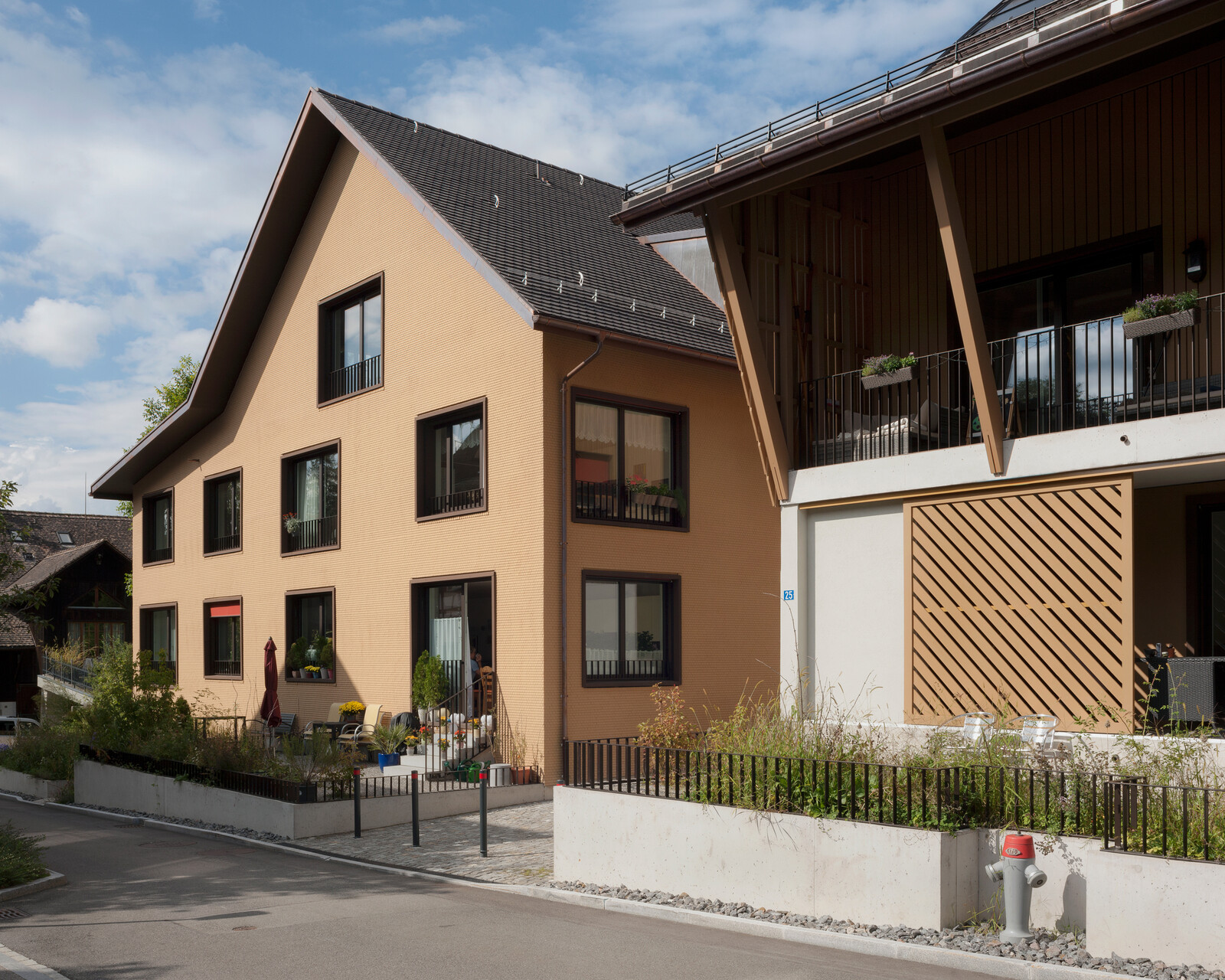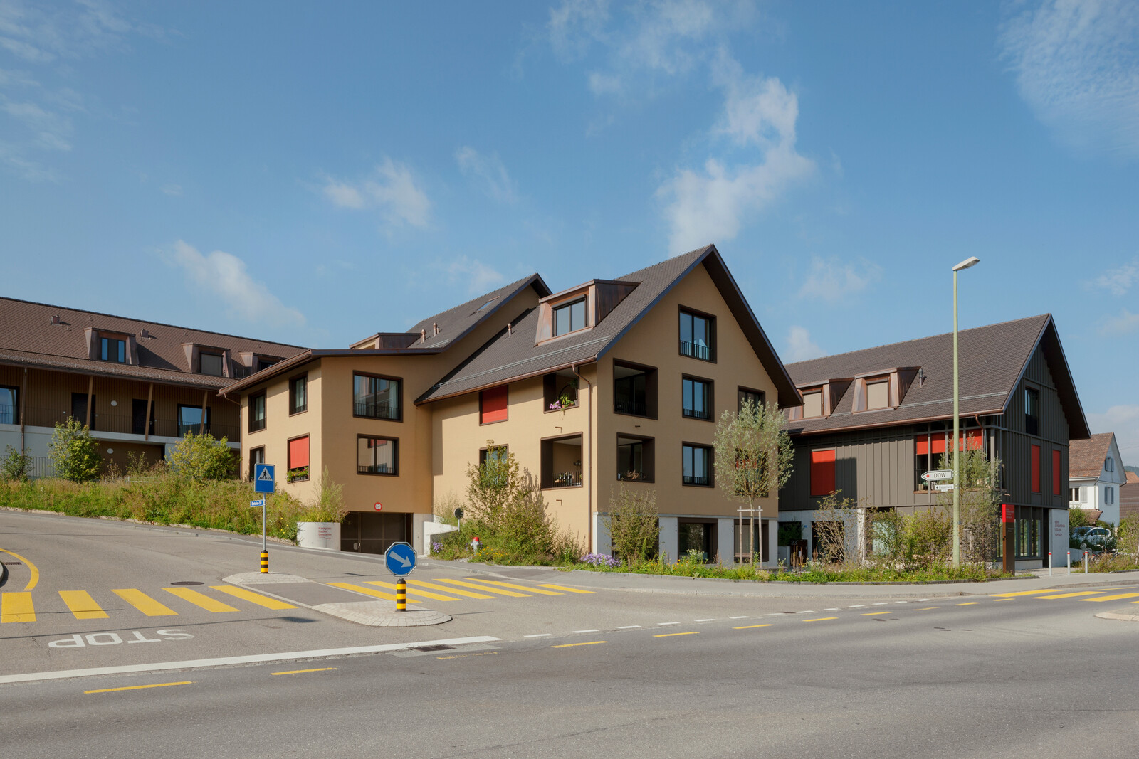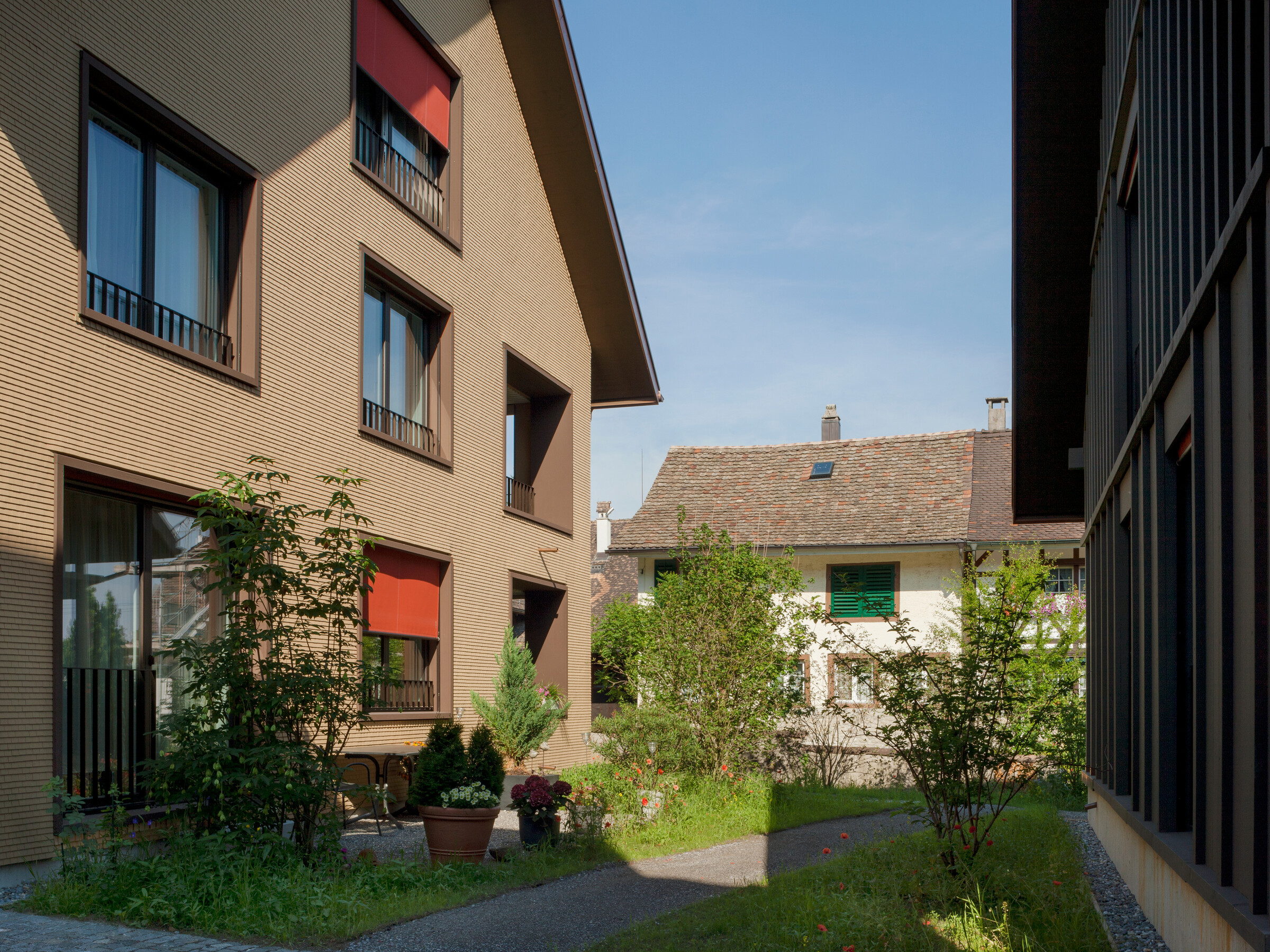 Der gewachsene Ortskern im Bereich Käpfner- Klosterweg zeichnet sich durch orthogonal zum Wegenetz angeordnete Gebäude mit unterschiedlich grossen Hofräumen aus. Dieser ortstypische Charakter ist Ausgangspunkt für die Neuüberbauung. Vier unterschiedliche gestaltete Einzelbauten nehmen die Körnung der Kernzone auf, die orthogonale Stellung der Wohngebäude erzeugt atmosphärisch stimmige Erschliessungs- und Hofräume. Unterschiedliche Grundrisstypologien, vielfältige Aussenräume und die Mischung aus Wohnen und Arbeiten prägen nebst vielfältigen Gebäudecharakteren, die Erscheinung der Neuüberbauung, welche sich an den Vorgaben der 2000-Watt-Gesellschaft orientiert.