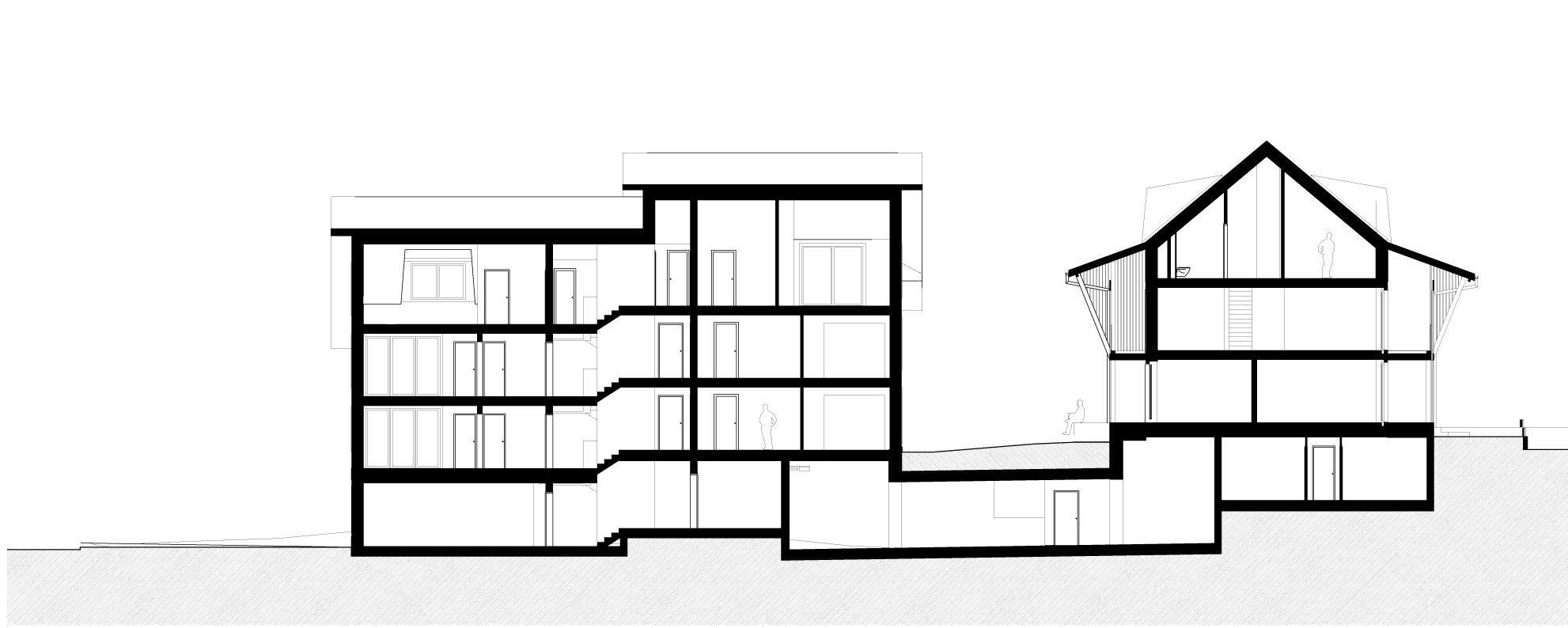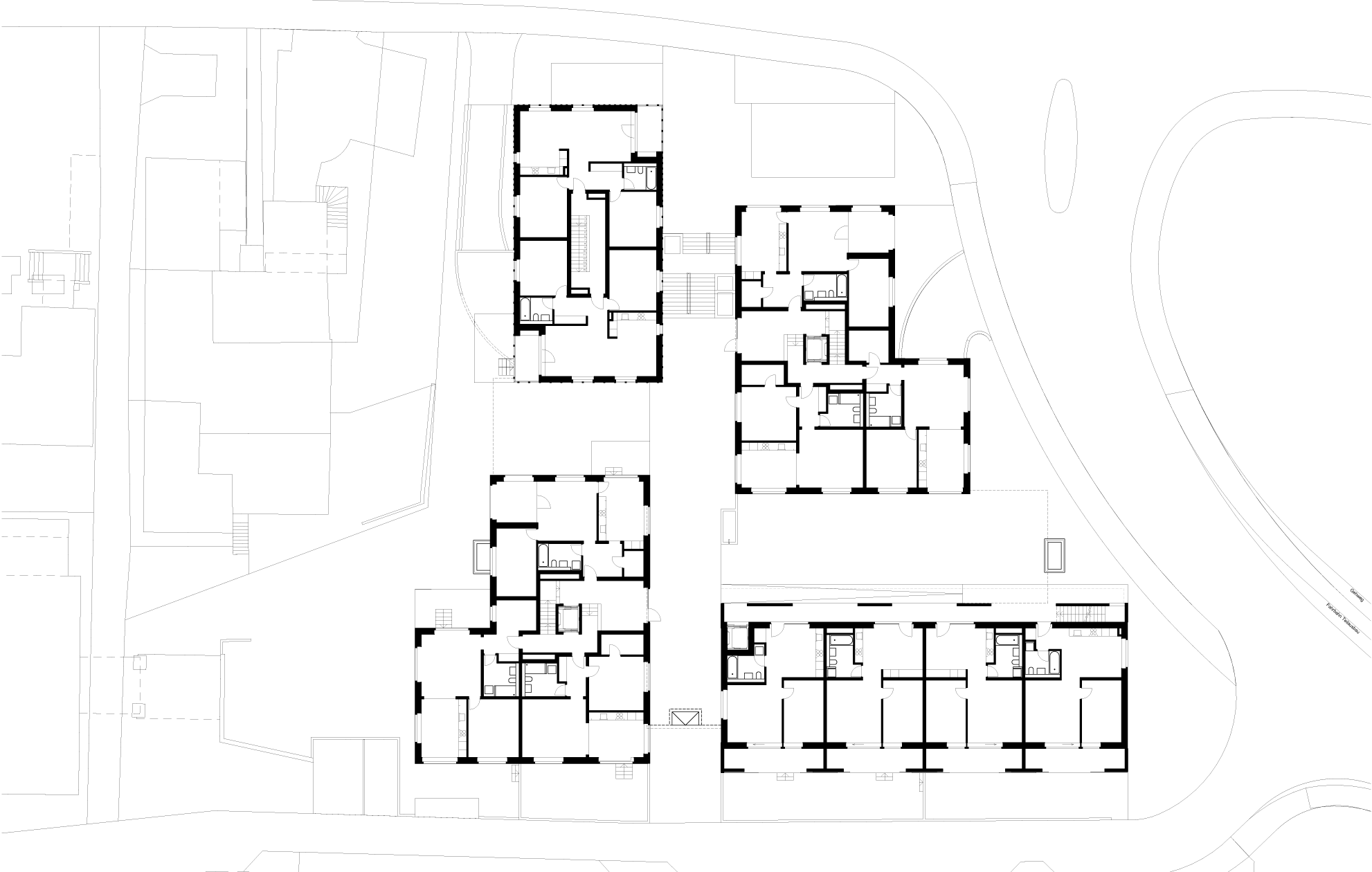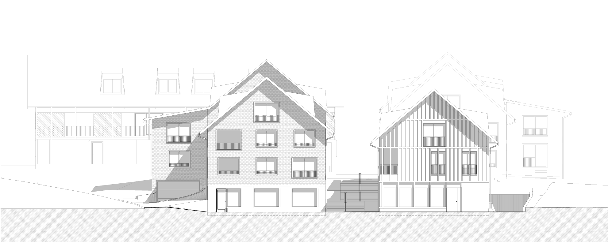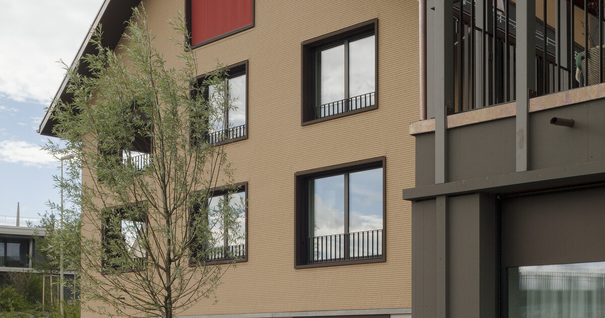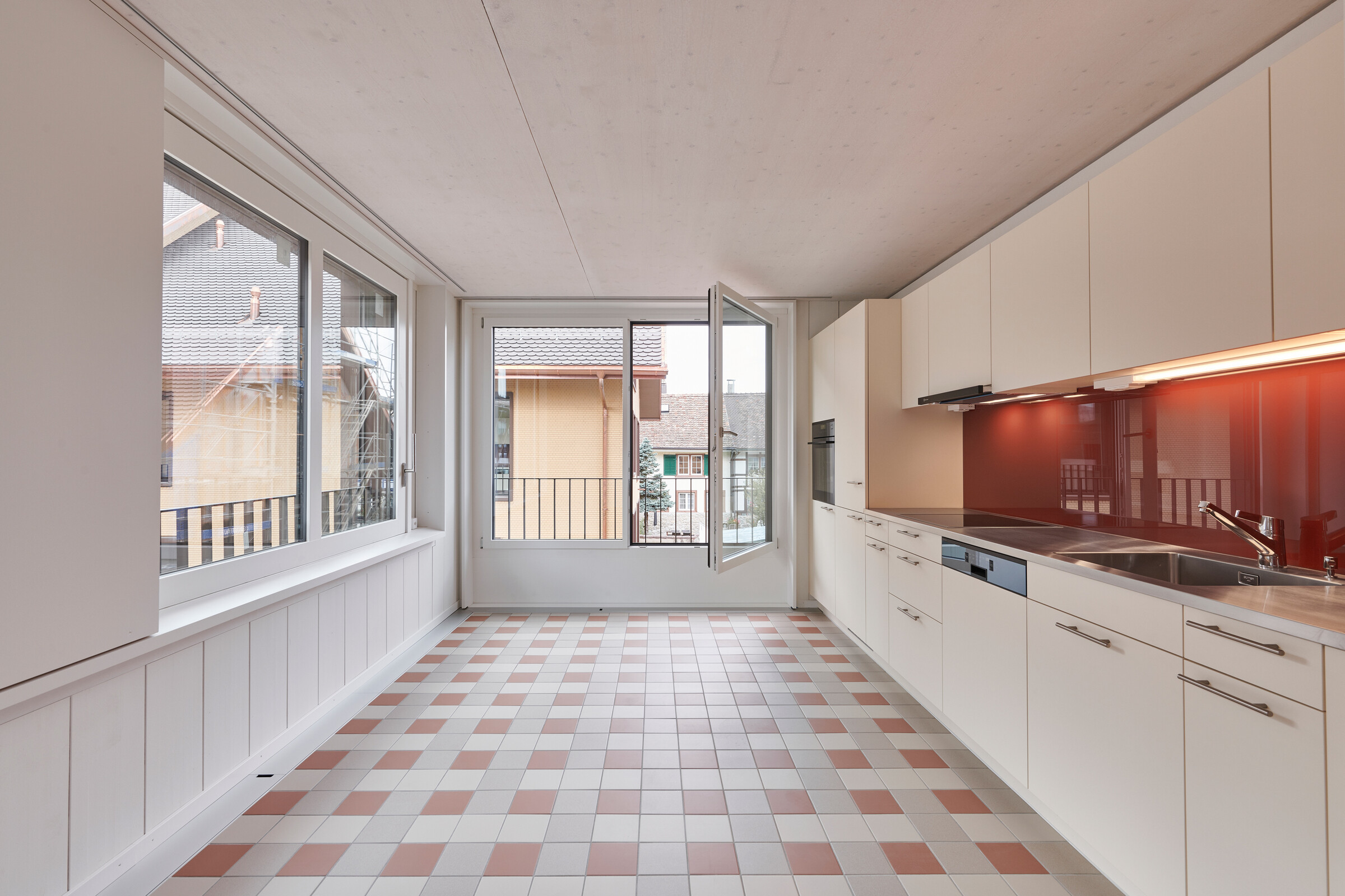 Der gewachsene Ortskern im Bereich Käpfner- Klosterweg zeichnet sich durch orthogonal zum Wegenetz angeordnete Gebäude mit unterschiedlich grossen Hofräumen aus. Dieser ortstypische Charakter ist Ausgangspunkt für die Neuüberbauung. Vier unterschiedliche gestaltete Einzelbauten nehmen die Körnung der Kernzone auf, die orthogonale Stellung der Wohngebäude erzeugt atmosphärisch stimmige Erschliessungs- und Hofräume. Unterschiedliche Grundrisstypologien, vielfältige Aussenräume und die Mischung aus Wohnen und Arbeiten prägen nebst vielfältigen Gebäudecharakteren, die Erscheinung der Neuüberbauung, welche sich an den Vorgaben der 2000-Watt-Gesellschaft orientiert.