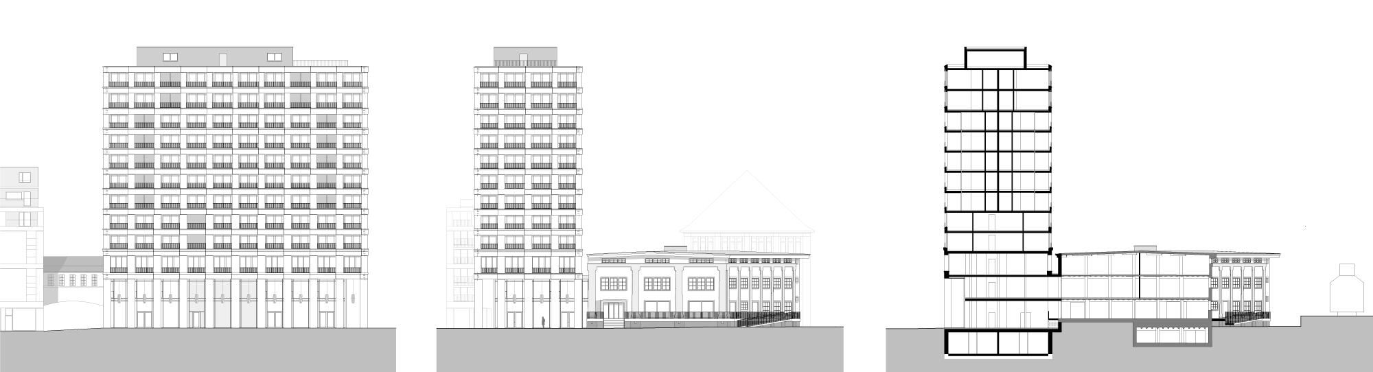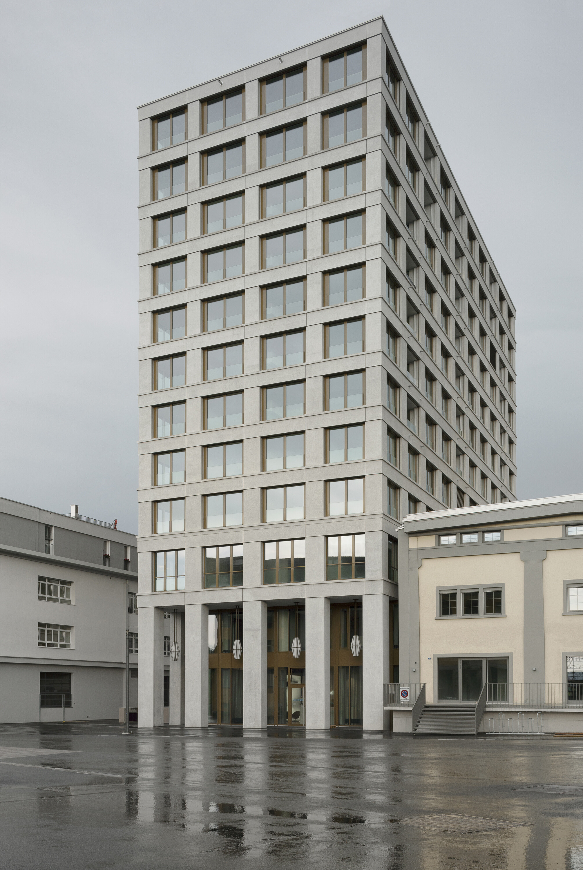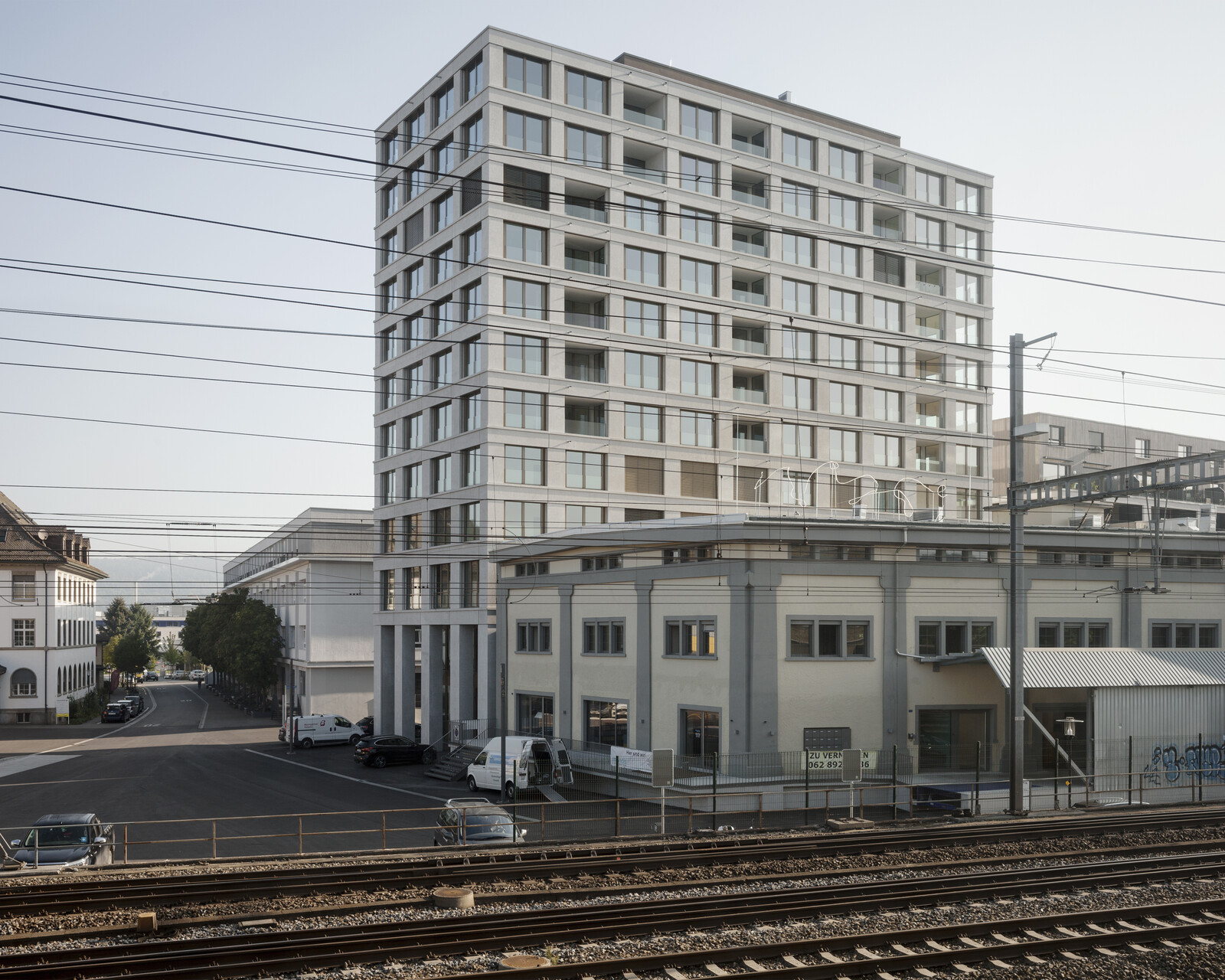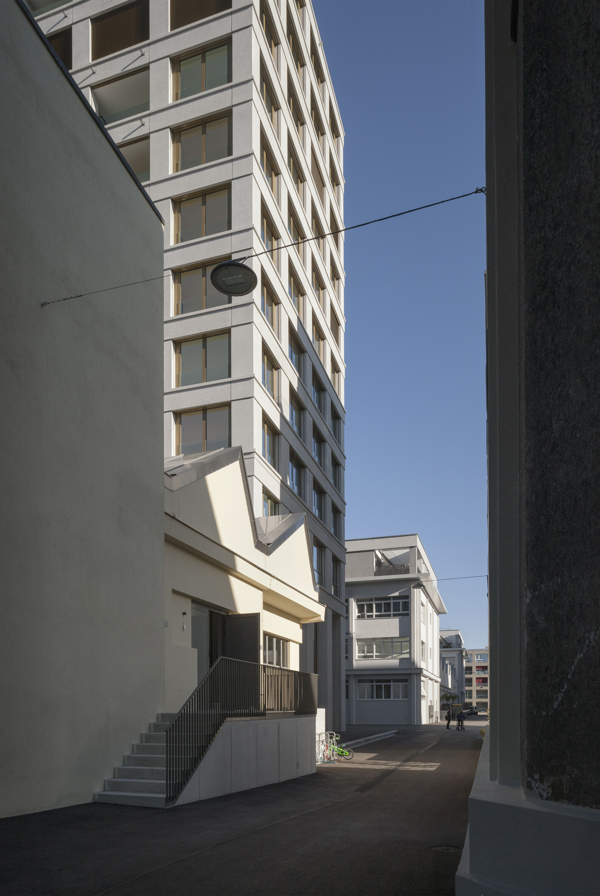 Ein Hochhaus für Lenzburg streicht die einmalige urbane Qualität des Ortes hervor, die dem historischen dreigeschossigen Fabrikationsgebäude, der alten Spenglerei, auf dem Bahnhofsareal innewohnt. Hier fand Geschichte statt, hier soll sie nun weitergeschrieben werden: Bestehendes und Neues gehen ineinander über, der Sockelbereich formuliert den Übergang vom Hochhaus zur historischen Bausubstanz. Das Wohnen und Arbeiten am erinnerungswerten Ort sieht zeitgemässe Räume vor: Im Erdgeschoss befinden sich öffentlichen Nutzungen, im ersten und zweiten Obergeschoss liegen Büros und in den folgenden Geschossen Wohnungen.