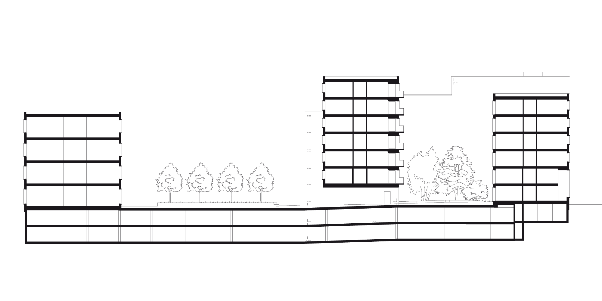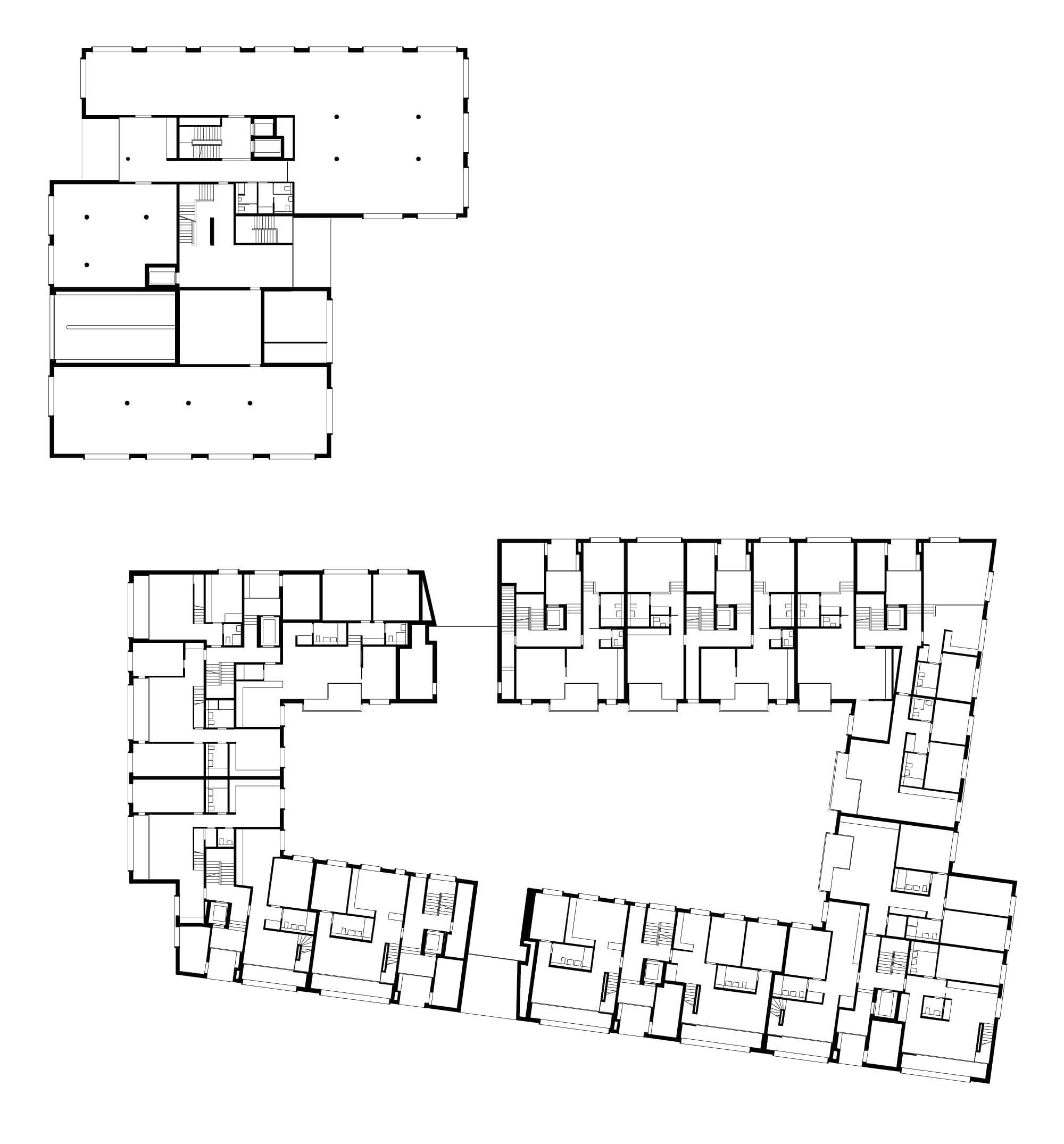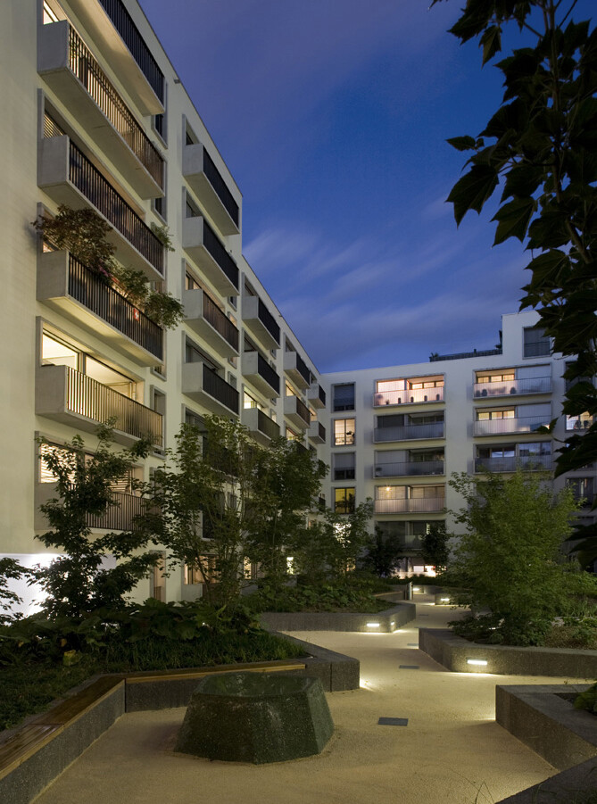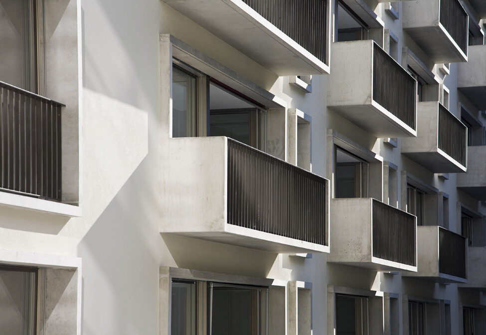 Die beiden fünf- bis siebengeschossigen Gebäude bilden eine kubische Komposition. Diese schafft einen direkten Bezug zur umliegenden Bebauung. Längs und quer verlaufende Sichtbezüge vernetzen die Neubauten mit der Nachbarschaft und der Badenerstrasse. Die Überbauung umfasst neben Läden und Büroflächen über 140 Wohnungen.