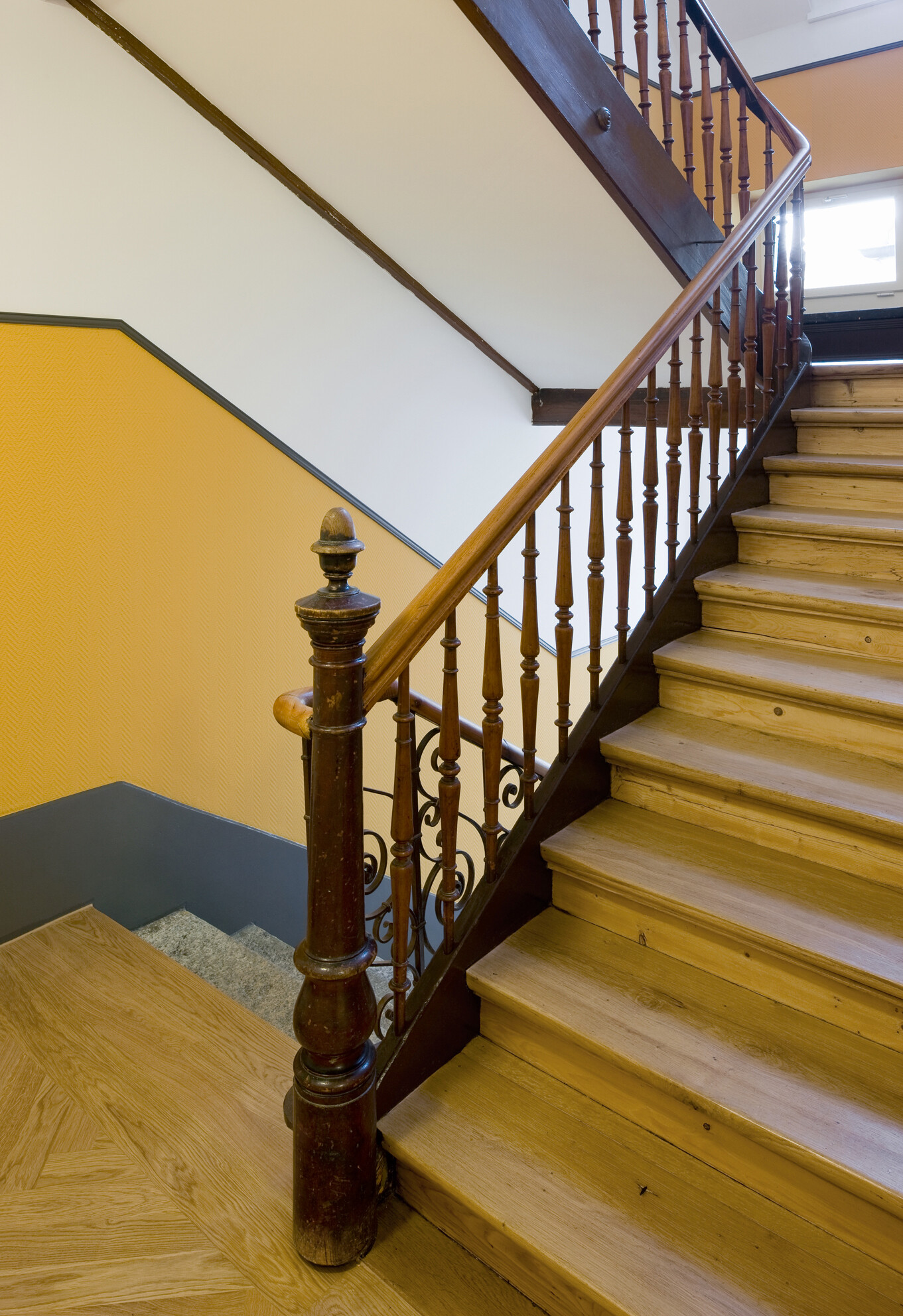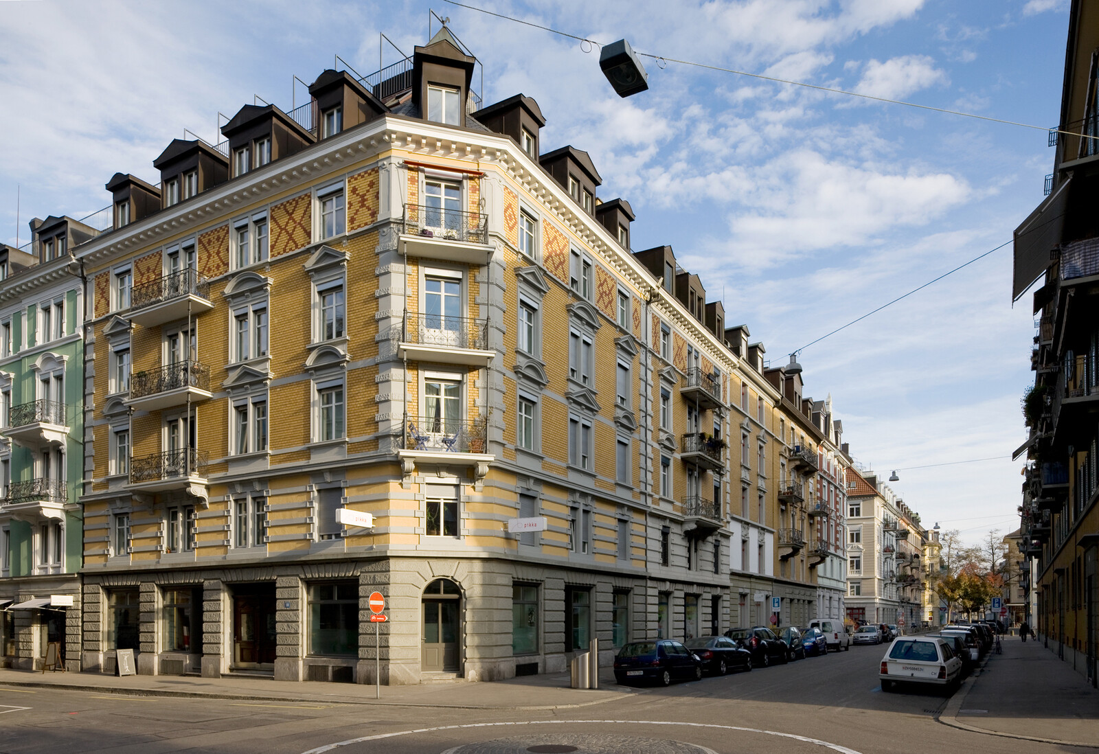 Das fünfstöckige Gebäude aus dem Jahre 1899 im Quartier Aussersihl beendet als Eckbau eine geschlossene Blockrandbebauung. Die Sichtbacksteinfassade ist im Neorenaissance-Stil gehalten. Über dem Ladengeschoss, befinden sich drei Wohngeschosse und ein Mezzaningeschoss. Die denkmalpflegerisch wertvollen Teile wie die Fassade sowie der Hauseingang mit altem Terrazzobelag und Wandbildern in Ölmalerei wurden schonend saniert. Die baulichen Eingriffe belassen zum grossen Teil die bestehende Raumstruktur, lediglich die Sanitärzonen wurden erneuert. Im bisher als Estrich genutzten Dachraum entstanden zwei Maisonette-Wohnungen, die einen direkten Zugang zur Zinne aufweisen.