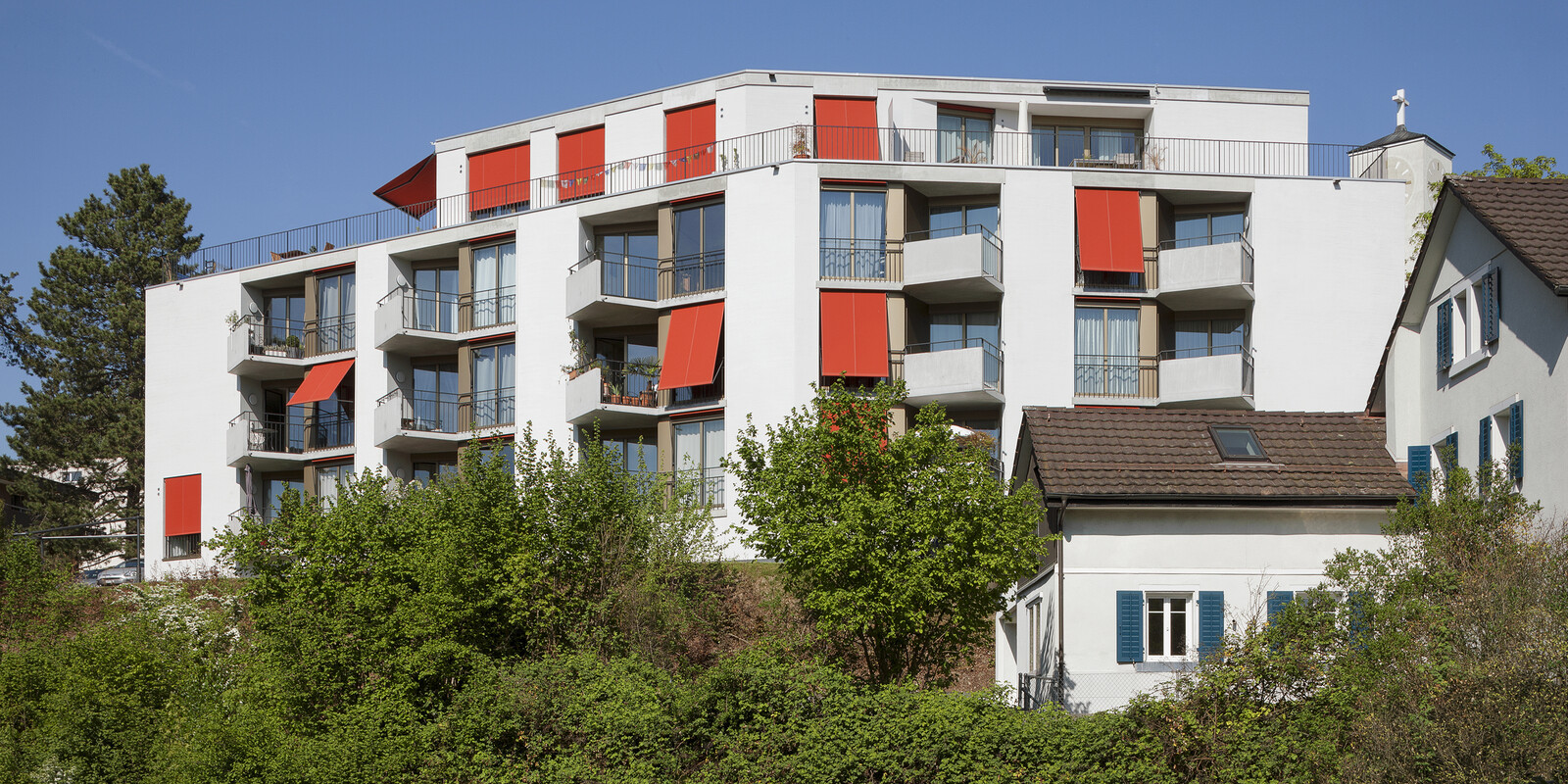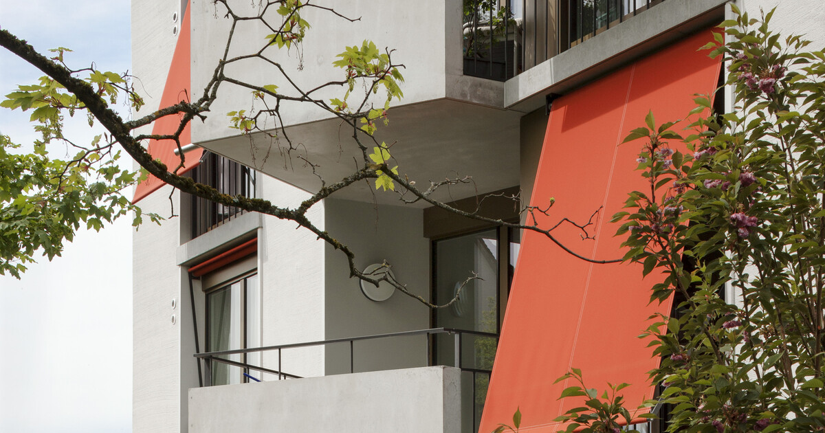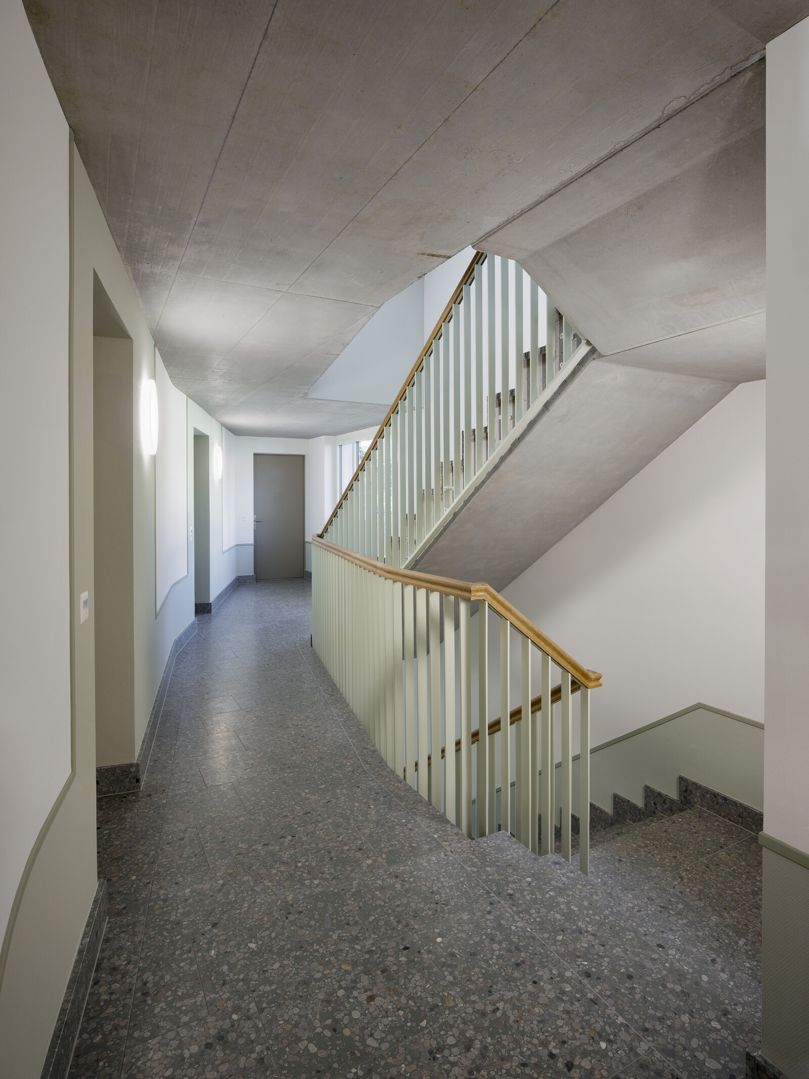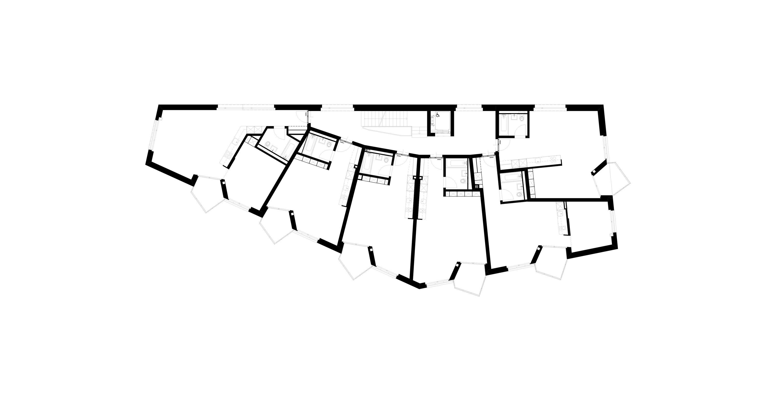 Der polygonale Neubau entwickelt sich aus der komplexen Geometrie und Topografie der Parzelle. Ein zentrales Treppenhaus erschliesst 20 Wohnungen. Der fächerförmige Grundriss mit markant in den Grünraum ausladenden Balkonen und der gegen Südwesten leicht geknickten Hauptfassade ermöglicht allen Wohnungen optimale Sonnenausrichtung und Ausblick. Der eingezogene Balkonbereich ragt in den Wohnbereich und bietet die Möglichkeit, mit einfachen Mitteln den Schlafbereich abzutrennen.