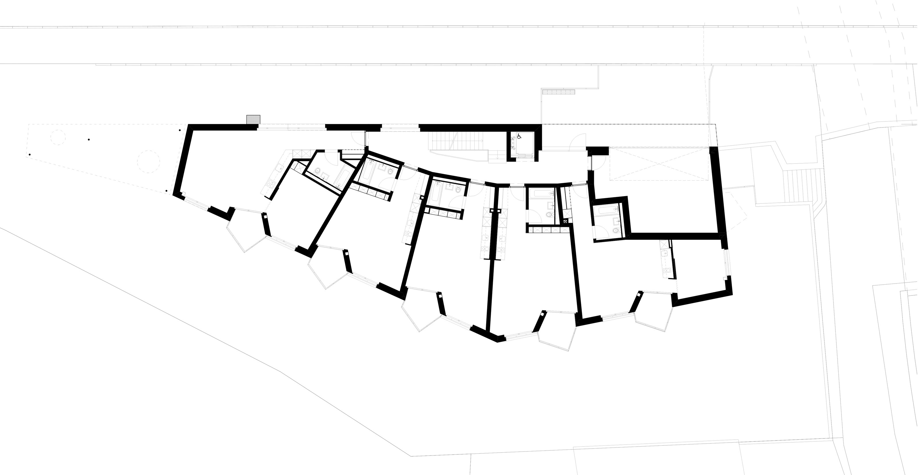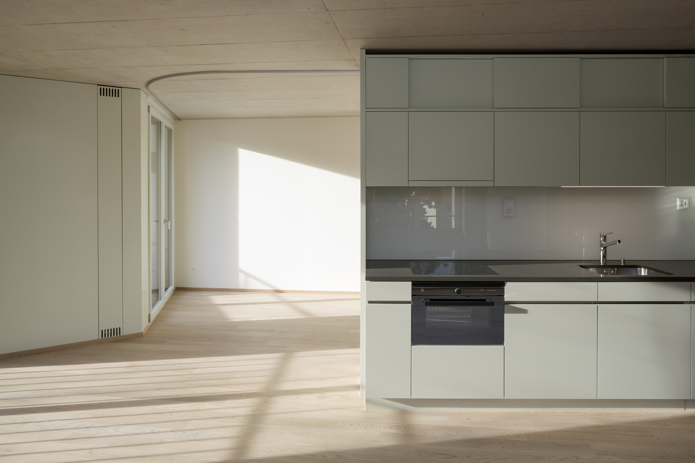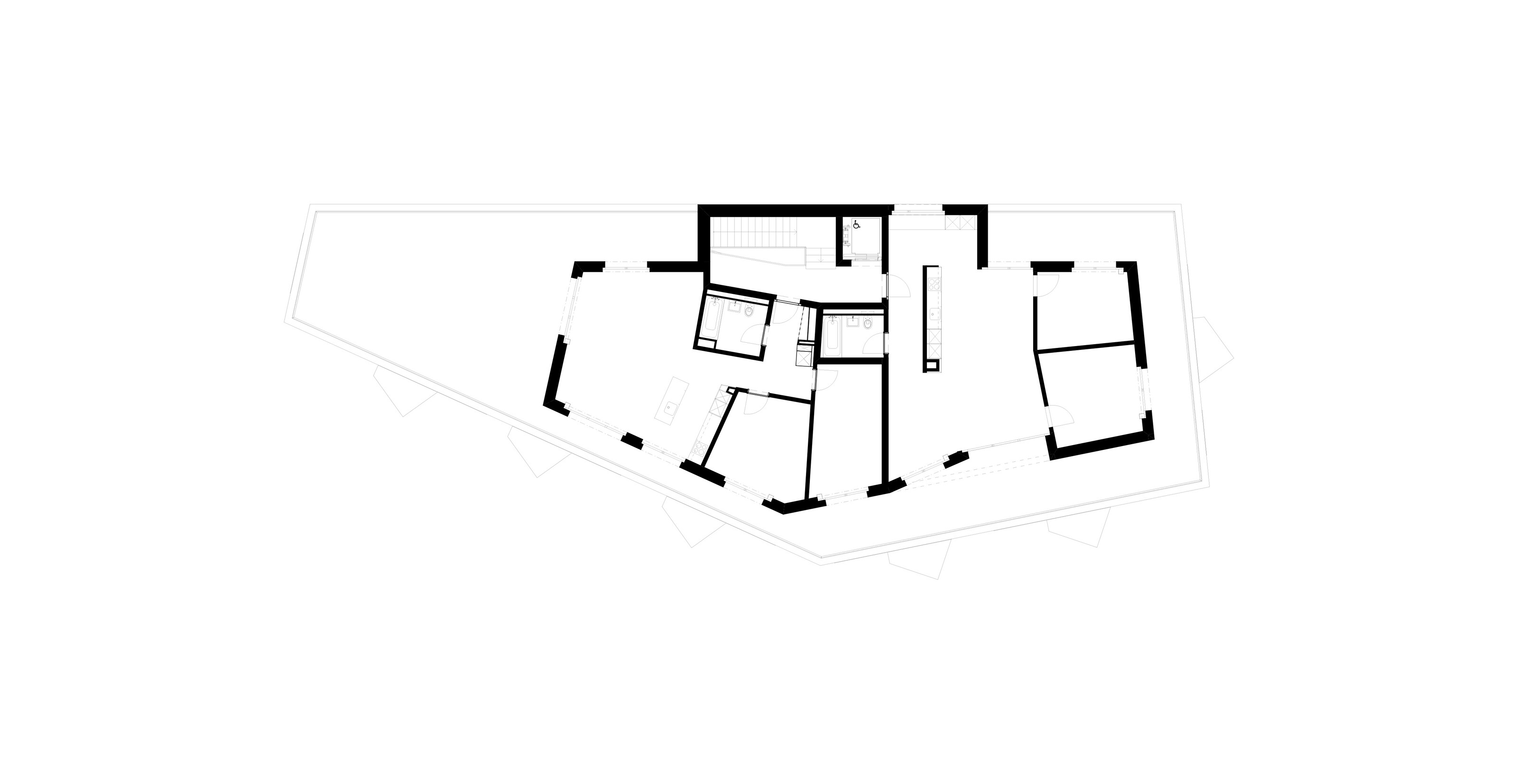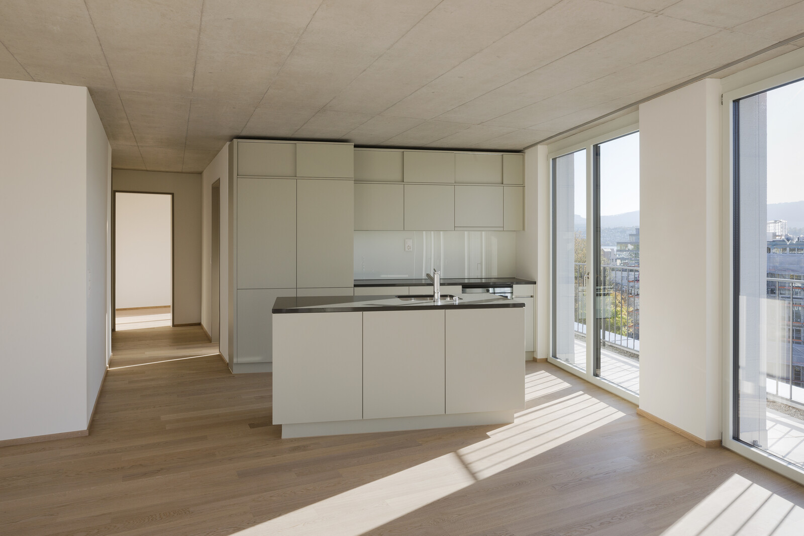 Der polygonale Neubau entwickelt sich aus der komplexen Geometrie und Topografie der Parzelle. Ein zentrales Treppenhaus erschliesst 20 Wohnungen. Der fächerförmige Grundriss mit markant in den Grünraum ausladenden Balkonen und der gegen Südwesten leicht geknickten Hauptfassade ermöglicht allen Wohnungen optimale Sonnenausrichtung und Ausblick. Der eingezogene Balkonbereich ragt in den Wohnbereich und bietet die Möglichkeit, mit einfachen Mitteln den Schlafbereich abzutrennen.