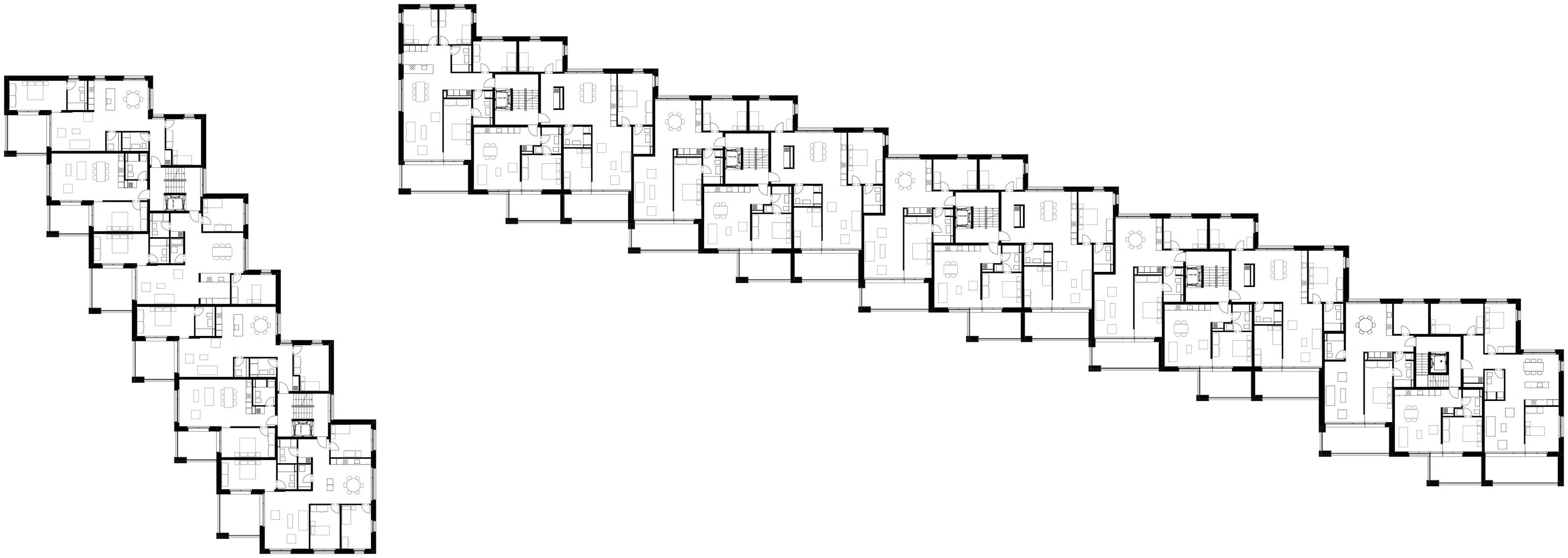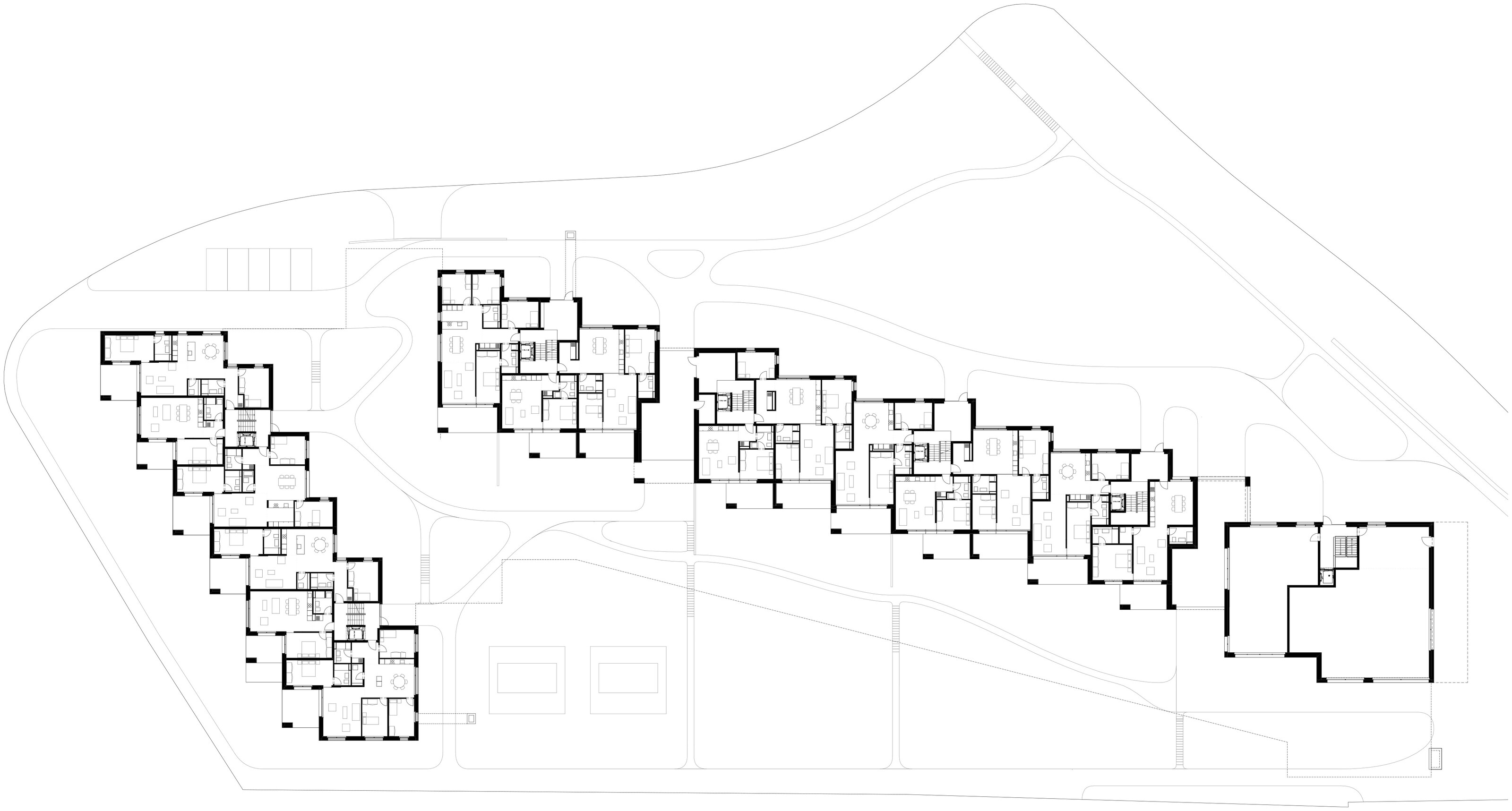 Das Areal Rossweid beschreibt eine eher periphere Wohnlage im Übergang zur Kulturlandschaft. Die markante Topographie, angrenzende Waldflächen und ein Pferdebetrieb prägen den Ort. Zwei Gebäuderiegel gliedern das Grundstück. Gemeinsam definieren sie einen weitläufigen, besonnten Aussenraum. Dieser hat das Potenzial zum Herzen des Quartiers zu werden, da er rundum an die Umgebung anknüpft. An bester Hanglage entstehen 66 Wohnungen, die von der Nähe zur Natur, dem ermöglichten Weitblick und den spezifischen Nachbarnutzungen profitieren. Die Dimension der Gebäude bewegt sich im Rahmen der in Gockhausen bestehenden Bauten. Die Länge der Baukörper wird zusätzlich zur Hangstaffelung durch Fassadenversprünge und eine vertikale Gliederung rhythmisiert.